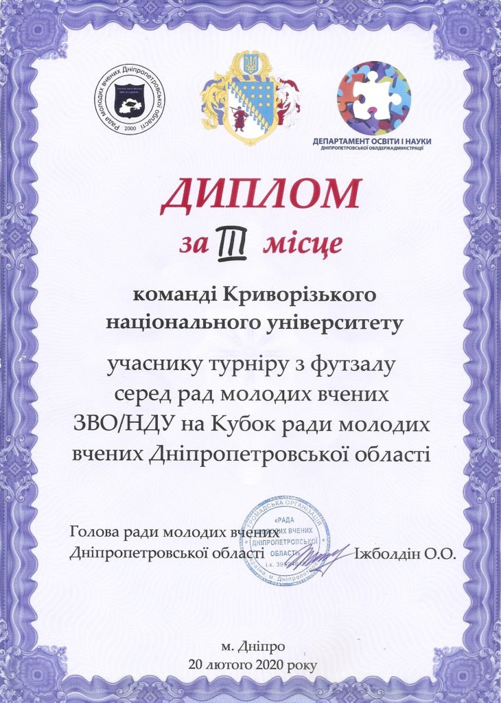 20.02.2020 року на базі Національного технічного університету «Дніпровська політехніка» вп’яте було проведено турнір на Кубок Ради молодих вчених Дніпропетровської області з футзалу. Цей спортивний захід присвячений 20-річчю Ради молодих вчених нашої області. Цього року в турнірі брали участь 6 команд закладів вищої освіти та науково-дослідних установ Дніпропетровської області. Вітаємо команду Ради молодих вчених за зайняте третє місце у змаганнях!